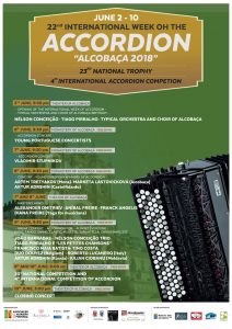 We will realize the 22nd International Accordion Week "Alcobaça 2018", between 2 and 10 June, in Portugal, as always. The International Week will integrate the 23th National Trophy as well as the 4th Accordion International Contest, on the 8th (Concert), 9th and 10th of June/2018.